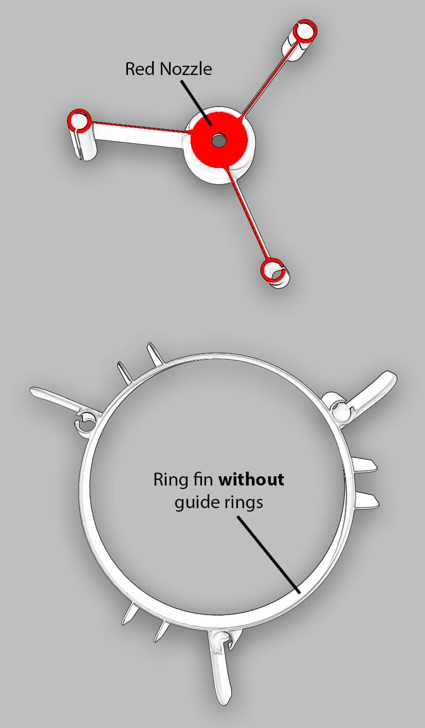 Only the 3- or 4-Stage rockets require this step. Locate a ring fin without guide rings, Then locate the RED nozzle . Insert one of the small rods into each receptacle of the ring fin. The rod should click into place. Then insert the other end of the small rods into the nozzle/strut receptacles until they click.