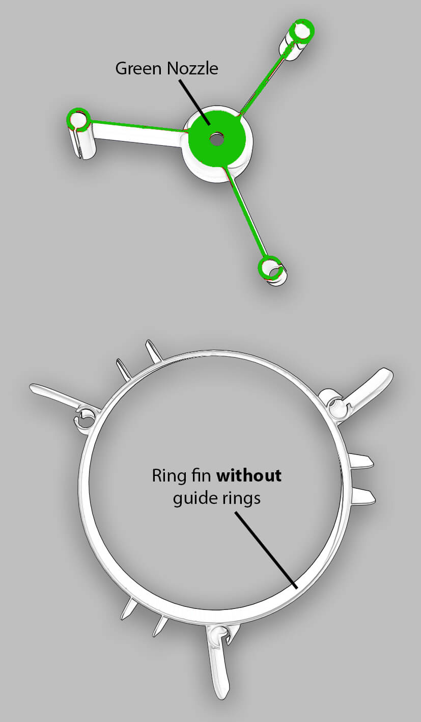 This is for 2-, 3- and 4-Stage rockets. Locate a ring fin without guide rings, Then locate the GREEN nozzle . Insert one of the small rods into each receptacle of the ring fin. The rod should click into place. Then insert the other end of the small rods into the nozzle/strut receptacles until they click.